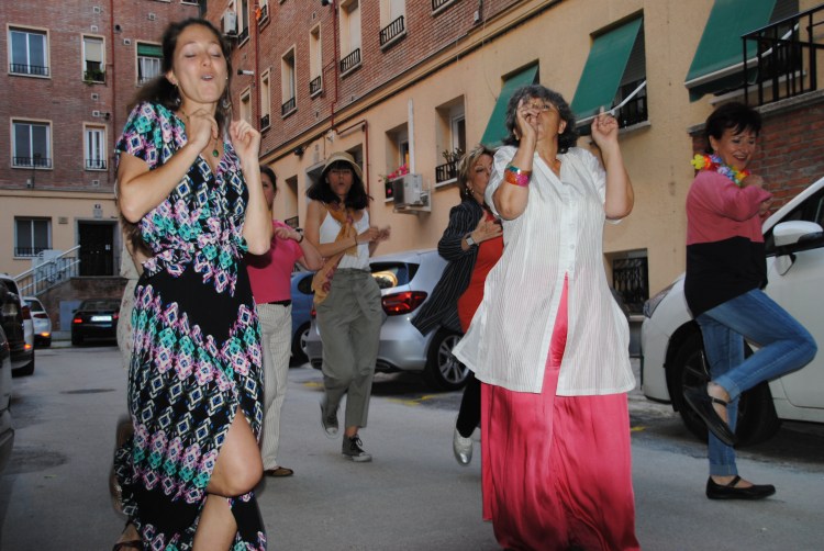 Chamberí Móvil fue el espectáculo final resultado del taller de teatro comunitario entre febrero y junio de 2018. Partimos de la historia del lugar donde nos reuníamos, el antiguo mercado del Poblado de San Cristóbal o Parque Móvil, para acabar construyendo una pieza de teatro itinerante sobre este cachito del distrito, pero también sobre nuestro vínculo con el barrio. Poca gente, incluso del propio distrito, conoce este lugar en plena calle Bravo Murillo. En el espectáculo, las participantes guiaban con un coche a más de cien espectadores por las calles del Poblado, e iban haciendo paradas donde sucedían escenas. Debajo de ventanas por las que aparecían actrices, en patios donde recreábamos historias de vecinos y vecinas a los que habíamos entrevistado, en el colegio donde se escuchaba un documental sonoro con las voces de un grupo de alumn@s, hablando de lo que les gusta y de lo que proponen para el barrio. También paramos en la Casa de Cultura, donde el público libremente paseaba encontrando escenas con las que interactuar. Temas como la infancia, lo prohibido en el barrio, lugares que están en riesgo de desaparecer y queremos proteger, y otros que ya desaparecieron pero queremos que no se olviden. Incluso se invitó al público a participar, dibujando sobre un mapa gigante en el suelo, qué querrían hacer con diferentes espacios o polémicas sucedidas en la actualidad en sus calles. Por último acabamos con una comida comunitaria en la compartíamos con los espectadores una especialidad gastronómica con la que teníamos un vínculo especial, y el público se podía llevar nuestras recetas en los programas de mano. Todo esto lo creamos dentro de un marco teatral: personajes, escenas, música y baile. Y con muchos espectadores: vecin@s que se emocionaban recordando parte de su historia, gentes de Chamberí y de otros barrios que descubrieron ese lugar por primera vez, familiares, amig@s y espontáne@s, niñ@s, median@s y mayores reunidos celebrando junt@s.
