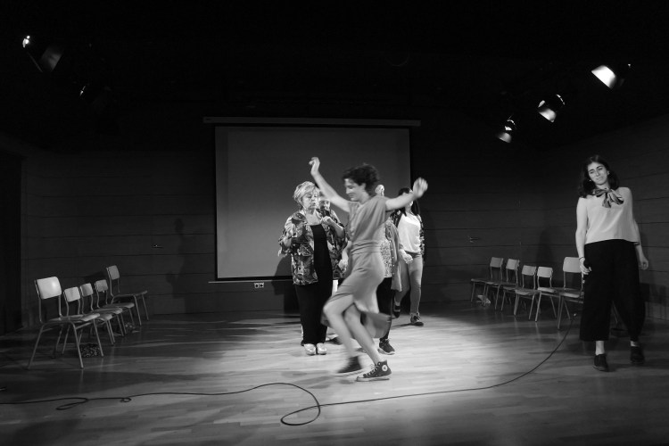Tras un segundo proceso de taller, presentamos Recorriendo huellas, el espectáculo que hemos creado colectivamente entre febrero y mayo de 2019. Fue estrenado en el Centro Cultural Galileo, y se hizo una segunda función en la Casa de Cultura y Participación ciudadana. Este año al grupo le interesaba el tema del papel de la mujer en el barrio, así que decidimos colaborar con el Colectivo La Liminal, que nos dieron un paseo por el barrio mostrándonos lugares del distrito donde las mujeres empezaron a traspasar el ámbito doméstico para irrumpir en el público. Esto nos situó en la época del primer tercio del siglo XX. Siguiendo la estela, decidimos entrevistar a varias mujeres mayores del Distrito con la ayuda del Proyecto Geros, y estas mujeres nos llevaron a la época después de la guerra. Y por último, reflexionamos dentro del propio grupo sobre las experiencias y dificultades entre las participantes a la hora de ocupar las esferas públicas de su vida. Así, hemos querido recoger algunas huellas de mujeres que habitaron y habitan el barrio, en tres generaciones diferentes, para preguntarnos por las dificultades a las que se han tenido que enfrentar.¿Quiénes fueron las primeras mujeres que tuvieron acceso a la educación superior?, ¿qué espacios se les negaron a nuestras mayores?, ¿y ahora, qué nos queda por conquistar? Partiendo de estas cuestiones, hacemos un recorrido desde el nacimiento de la Residencia de Señoritas, pasando por la dictadura, para acabar con las propias experiencias de las participantes del grupo. Una mirada más allá sobre las huellas invisibles del barrio que habitamos.