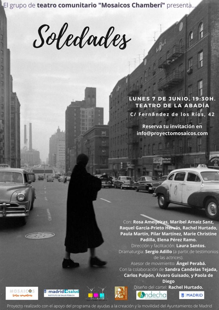 Soledades es el tercer espectáculo del grupo de Teatro Comunitario del Proyecto Mosaicos en el Distrito de Chamberí. Es el resultado de un proceso de año y medio de creación colectiva con vecinas del barrio. El proceso comenzó en enero de 2020, se vio interrumpido por la pandemia del Covid durante seis meses, y se retomó nuevamente hasta estrenarse en junio de 2021 en el Teatro de la Abadía de Madrid.
